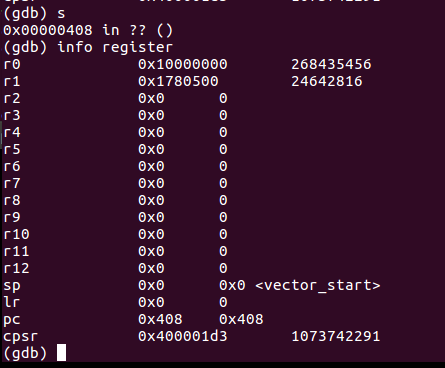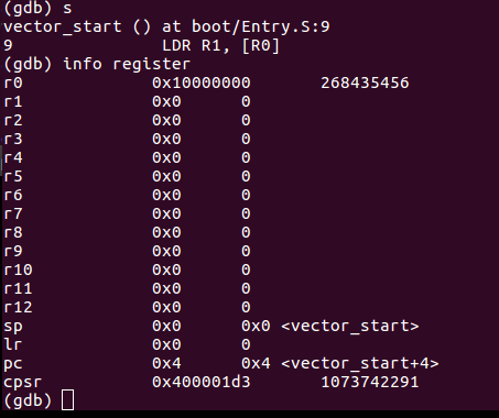 gdb) s : 1 step 실행. 즉, r0에 0x1000000주소값을 대입 하는 과정을 실행한 결과를 나타낸다.