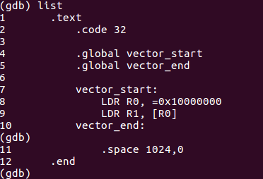vector_start가 0x00000000에 배치되어 있고 명령이 MOV R0, R1인 것을 확인 가능하다. 기계어로는 0XE1A00001