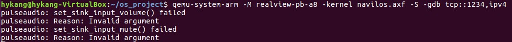 $ qemu-system-arm -M realview-pb-a8 -kernel navilos.axf -S -gdb tcp::1234,ipv4