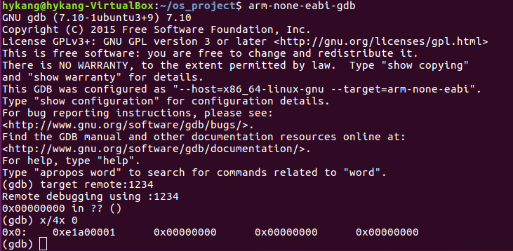 target remote:1234 : 1234 포트를 통해 qemu에 접속