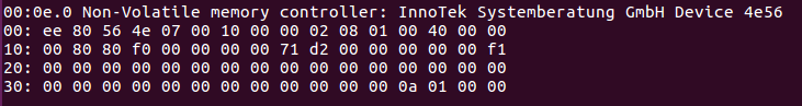 PCI slot에 연결된 디바이스들에 대해 정보를 알기 위해선 리눅스에서 lspci 명령을 통해 알수 있다. Configuration address 중 PCI header 부분에 대해서만 알고 싶다면 -x 옵션을 전체 4KB에 대한 영역 전부 알고 싶다면 -xxx 옵션을 주면 된다. 아래는 Virutual box에서 가상으로 생성한 NVMe device의 결과이다.