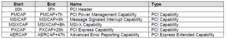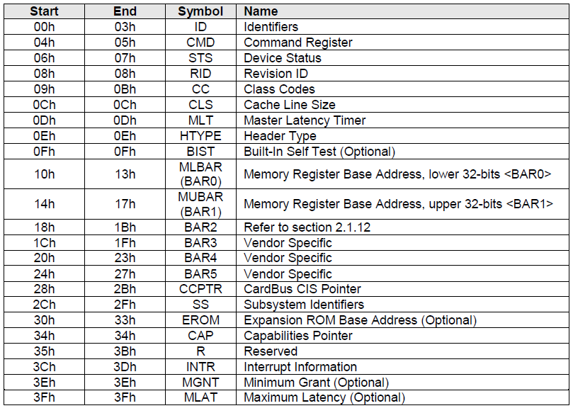 PCIe register에 대한 큰 틀에서의 구성이다. SSD 내에 존재하는 controller의 PCIe와 관련된 IP의 register들에 대한 설정이다. PCI header는 0x00 ~ 0x3F까지 범위이며, 뒤의 register들은 펌웨어에서 메모리 어느 부분에 베이스 주소를 가지고 갈 것인지에 따라 다르게 설정될수 있다.