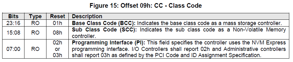 - 대 분류, 중분류라고 생각 하면 될거 같다. mass storage 중에서도 플로피 디스크, IDE 등 다양한 storage들이 존재하는데 그 중에서 sub class code가 0x08이므로 non-volatile memory를 나타낸다.