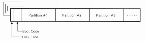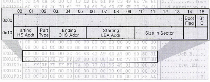 - DOS 파티션 테이블이 물리적으로 위치하는 곳은 디스크 0번 섹터 내 MBR 영역의 부트코드 바로 다음에 해당된다.