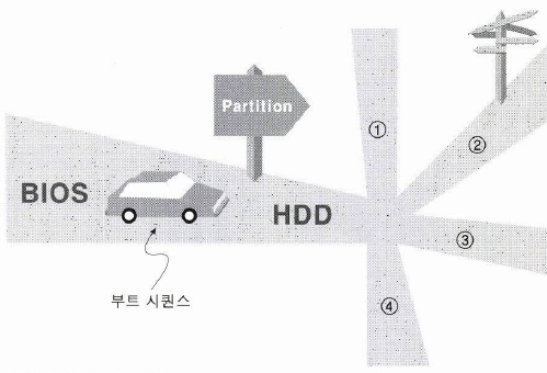 위 그림의 경우 PC의 부트 시퀀스가 BIOS를 거쳐 부팅 가능한 파티션으로 가기 위한 표지판 앞을 지나고 있다.