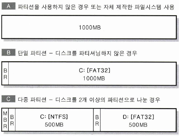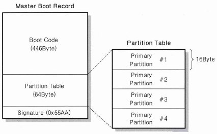 - 파티션을 나누어 사용하는 경우 MBR(디스크 0번 섹터) 영역 내에 '파티션 테이블'이 있다.