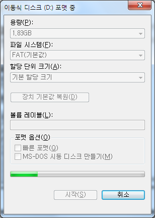 - 32MB 이하는 FAT 16 파일시스템밖에 선택 할 수 없을 것이고, 2GB 넘어가면 FAT 32파일시스템 밖에 선택할 수 없지만, 32MB ~ 2GB 사이라면 FAT16과 FAT32 파일시스템 중에서 선택할 수 있게 된다.