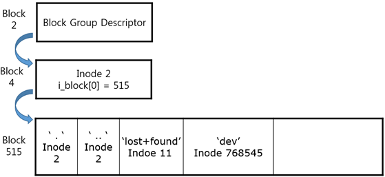 - 0x00x70 아래 부분이 Inode사이의 경계가 되며 Super Block의 inode per group 항목의 개수만큼 연속적으로 기록되어 있기 "때문에 Inode Table의 전체 크기를 쉽게 계산하여 블록 데이터 영역을 찾을 수 있게 됩니다.