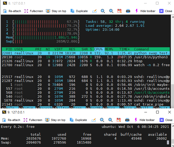 python script가 page를 많이 소비하고 있으며, 그때마다 page 할당을 위해 swap한다. 이때 swapd0에 의해 swap이 발생되는 trace를 확인할 수 있었고 free 수행시 swap의 used 개수가 증가함을 확인 가능했다.