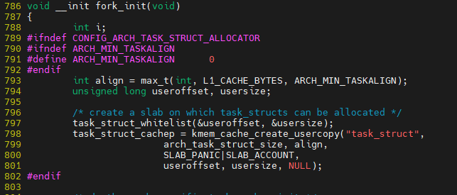 kmem_cache_create_usercopy()를 통해 kmem_cache_create 호출되면서 task_struct를 위한 page가 할당됨