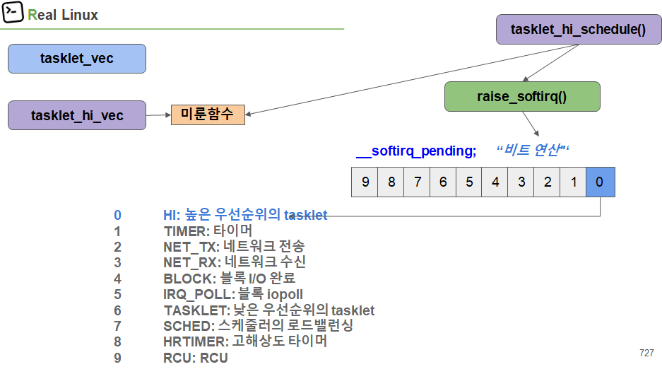 이때, TH 부분의 __raise_softirq() 부분이 __softirq_pending 변수의 bit 부분에 대해 set 한다. 이것을 통해 추후에 이 부분에 대해 irq handle을 해달라고 요청하는 것이다. 이것이 set되어 있기 때문에 irq_exit 이후에 연속적으로 할수도 있는 것이다.